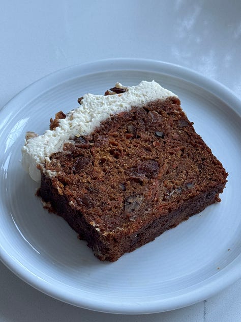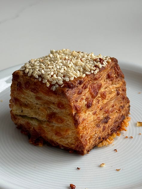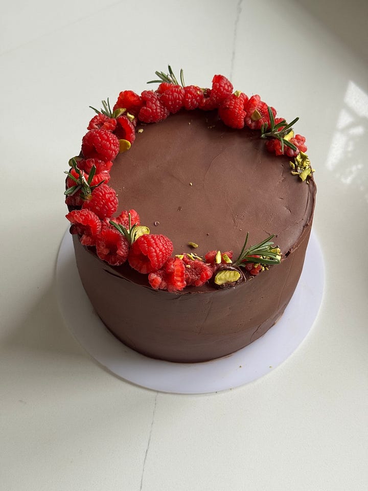 … more bake fun. Carrot loaf cakes galore - three renditions so far, more to trial - I’m obsessed. Flaky cheese biscuit/scone skyscrapers - for soup, for snacking, for being brilliant - layers like you’ve never seen - Shrek would be impressed; I’m refining these, can’t wait to share!! Jammy baked plums - edible jewels! And, not a bake, but always a comfort, veggie dal!!! Next, a lemon loaf monstrosity; it scored 10/10 in the flavour department, but was a structural abomination, I’m talking catastrophic dippage in the middle - bad things happen in this kitchen too folks!! Fortuitously there was surplus batter that I baked off in a couple of cupcake cases - worked a dream - even better with some whipped lemon cream cheese on top (a sunshine cupcake!). AND, further redemption after this chaos, my third rendition of that swanky (birthday) choccy cake: a cocoa cloud genoise sponge, brushed with chocolate ‘gravy’ (aka a cocoa sugar syrup), sandwiched with raspberry jam & whipped mascarpone, and enrobed in silllllky ganache. She’s a supermodel.