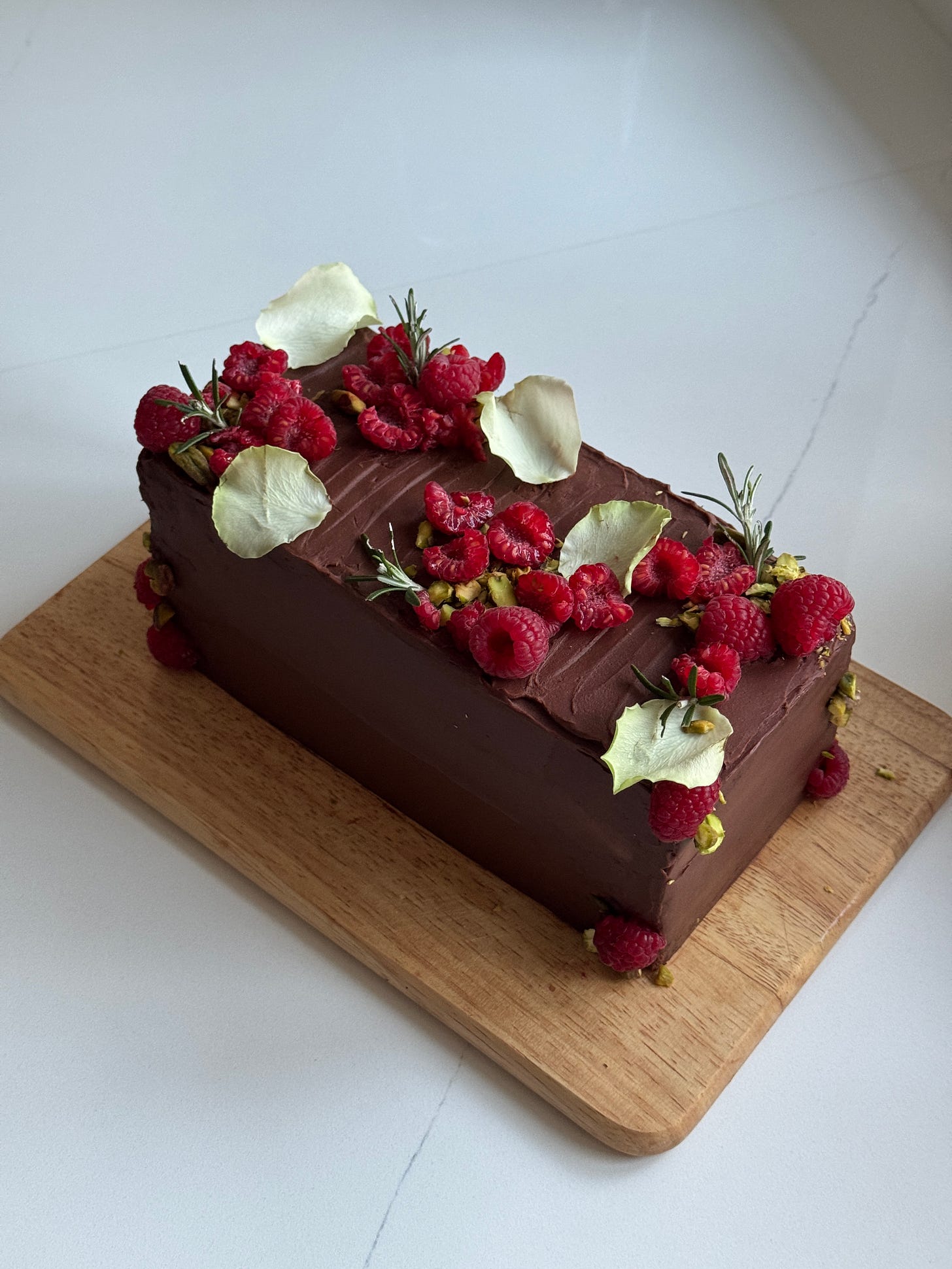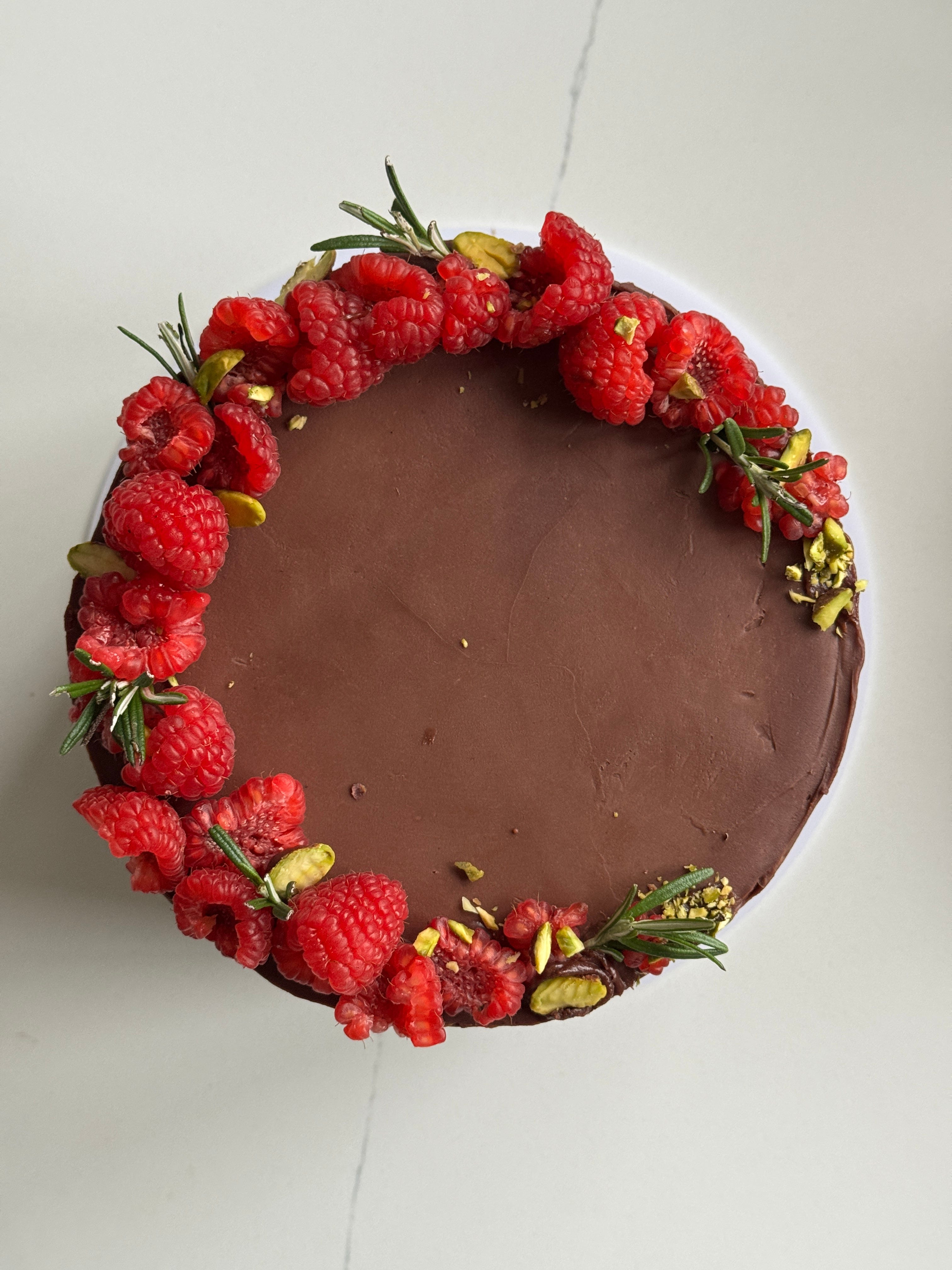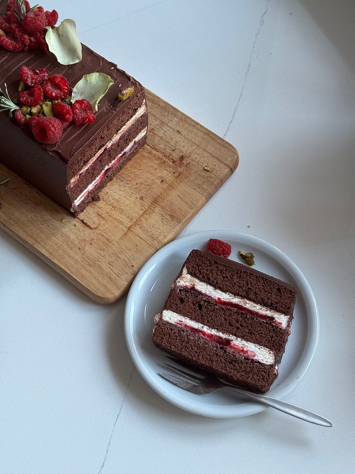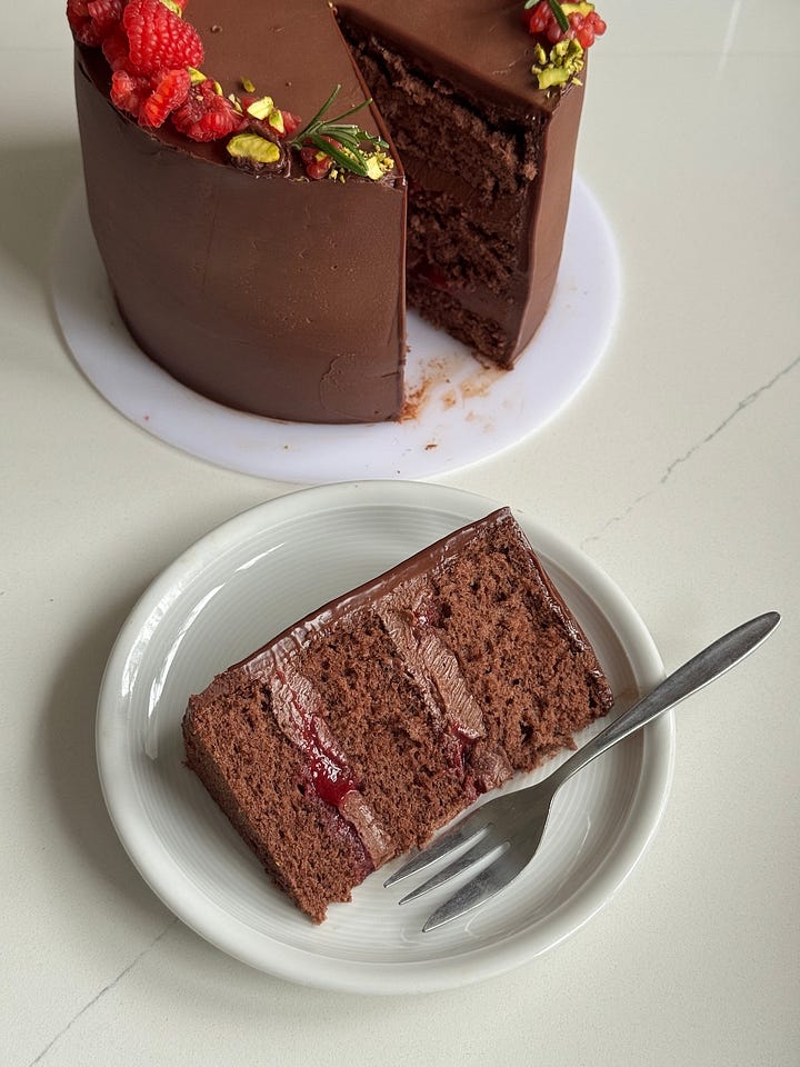 Specifically, this cake comprises: a super fluffy extra virgin olive oil cocoa genoise sponge - it’s a CLOUD! It doesn’t slap you in the face with dense fudgy chocolateyness, it’s delicate and refined, melt in the mouth airy fairy delicious! This is brushed with a chocolate gravy (aka a cocoa sugar syrup), which contains a touch of coffee powder to enhance the cocoa flavour. The syrup adds both flavour and a little moisture to the sponge - also just drink it neat if you like. Between the ‘sheets’, three to be specific, is a combination of lightly whipped mascarpone, and a smooth, tart raspberry ‘jam’. The assembled cake tower is enrobed in a silky chocolate ganache, and finally decorated with fresh raspberries and pistachios, mainly for the glam, but also, when is a pistachio not welcome? You may have noticed that one of my first renditions of this cake was with a chocolate crémeux filling (a half batch of this recipe if you would like to try it), it was delicious but a bit too heavy against the lightness off the sponge (IMO), the whipped mascarpone alternative is more delicate and a little fresher, I find. Oh and… you can either opt for round or rectangular - to suit your mood - I’ve given instructions for both!