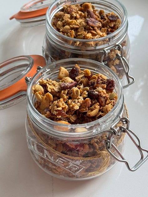 Then onto my next mindful bake, granola! A ‘use up leftovers hodgepodge’ that worked a dream. It’s meant for a friend who’s staying this weekend, but I can’t stop snaffling handfuls. It’s flavoured with tahini, extra virgin olive oil, cardamom and honey and contains all the usual suspects: oats, seeds (linseeds for good clusterage), nuts and plump fruit. It smells majestic as it bakes (as you would expect); toasty, warming, comforting, tick tick tick. Impeccable January/February fodder; feels wholesome, IS wholesome, best with rich Greek yog, and baked jammy plums (marmalade even!???), the perfect balanced breakfast bowl (and lunch and dinner, also snack??). Good.