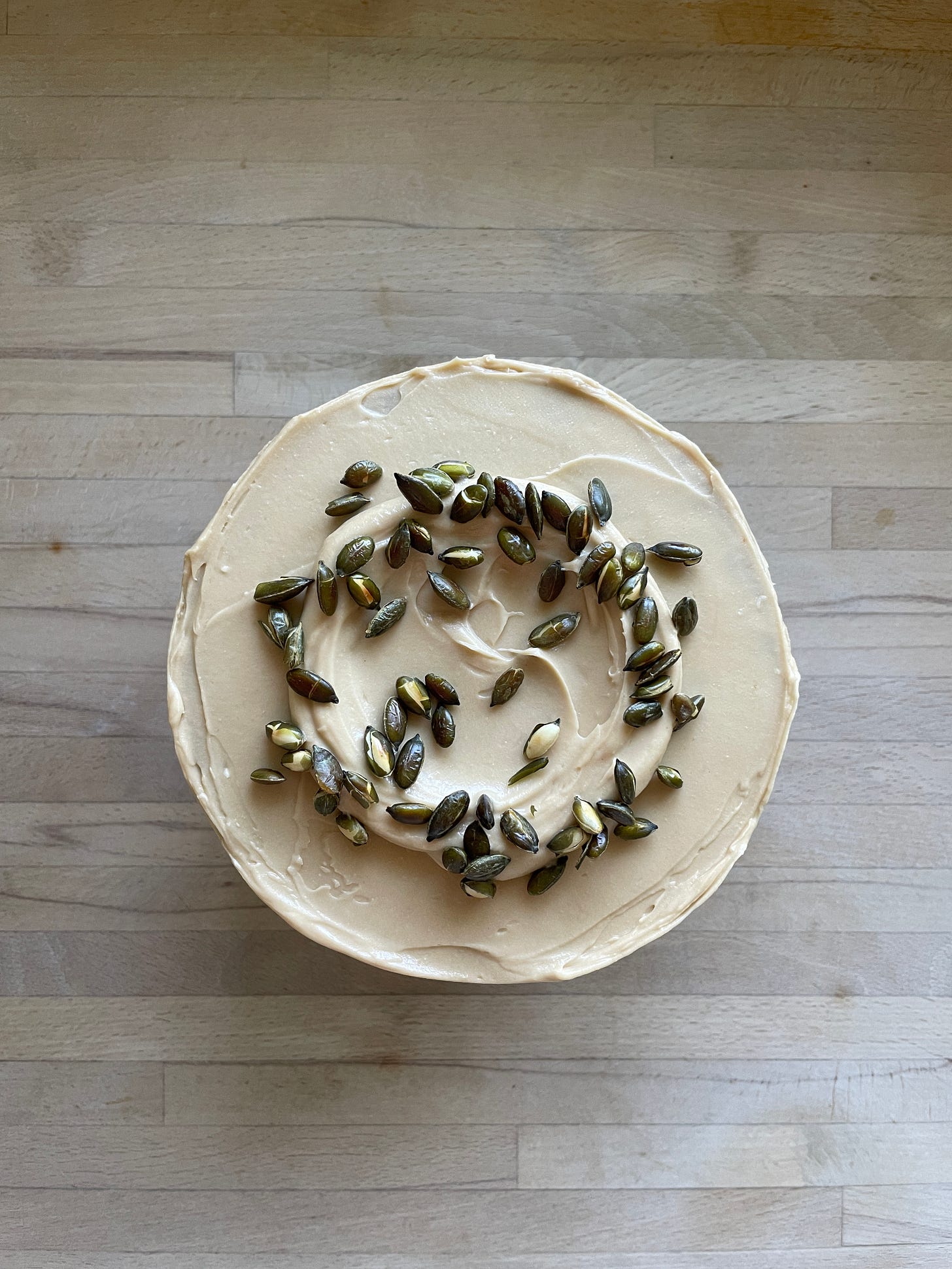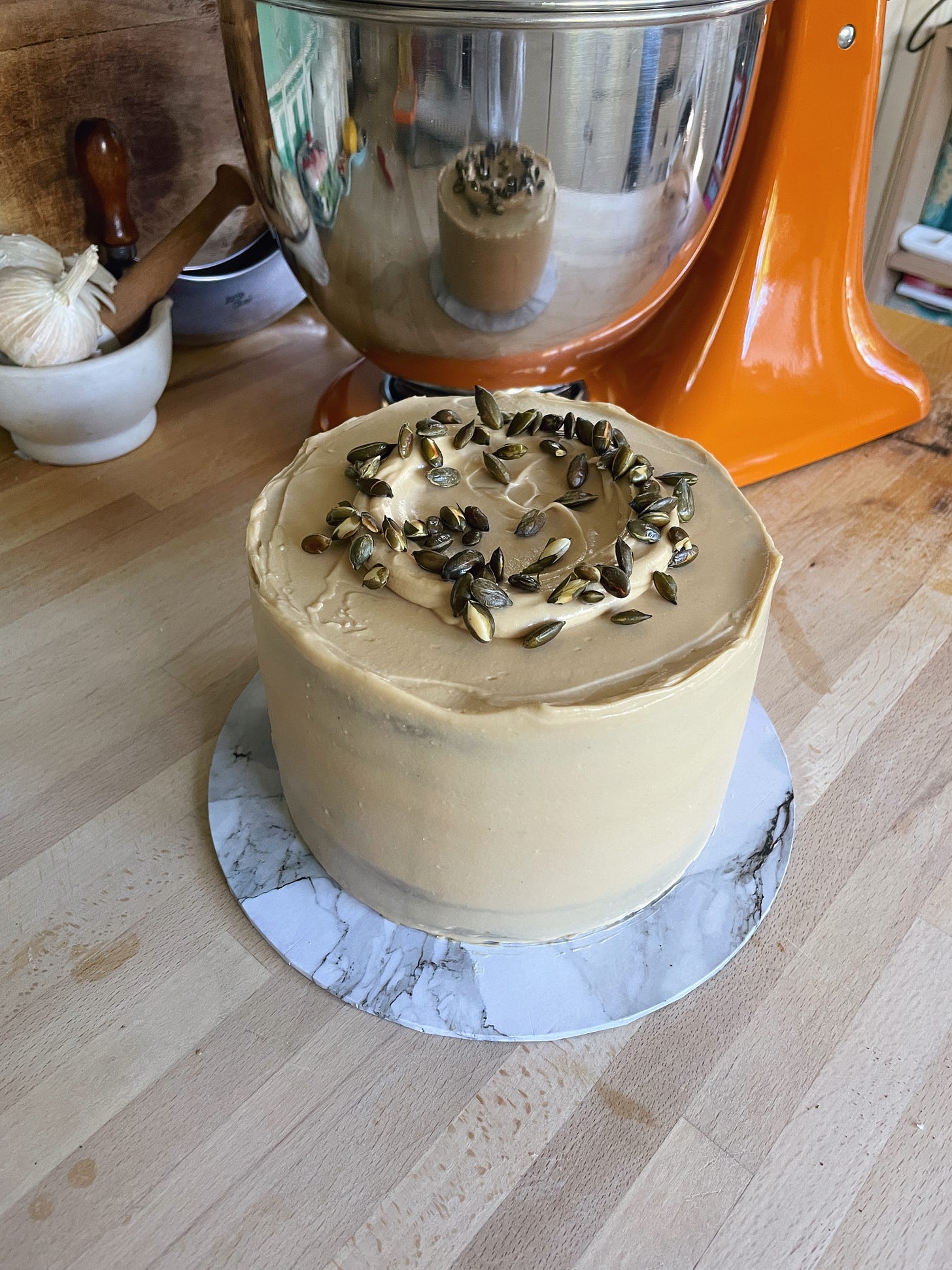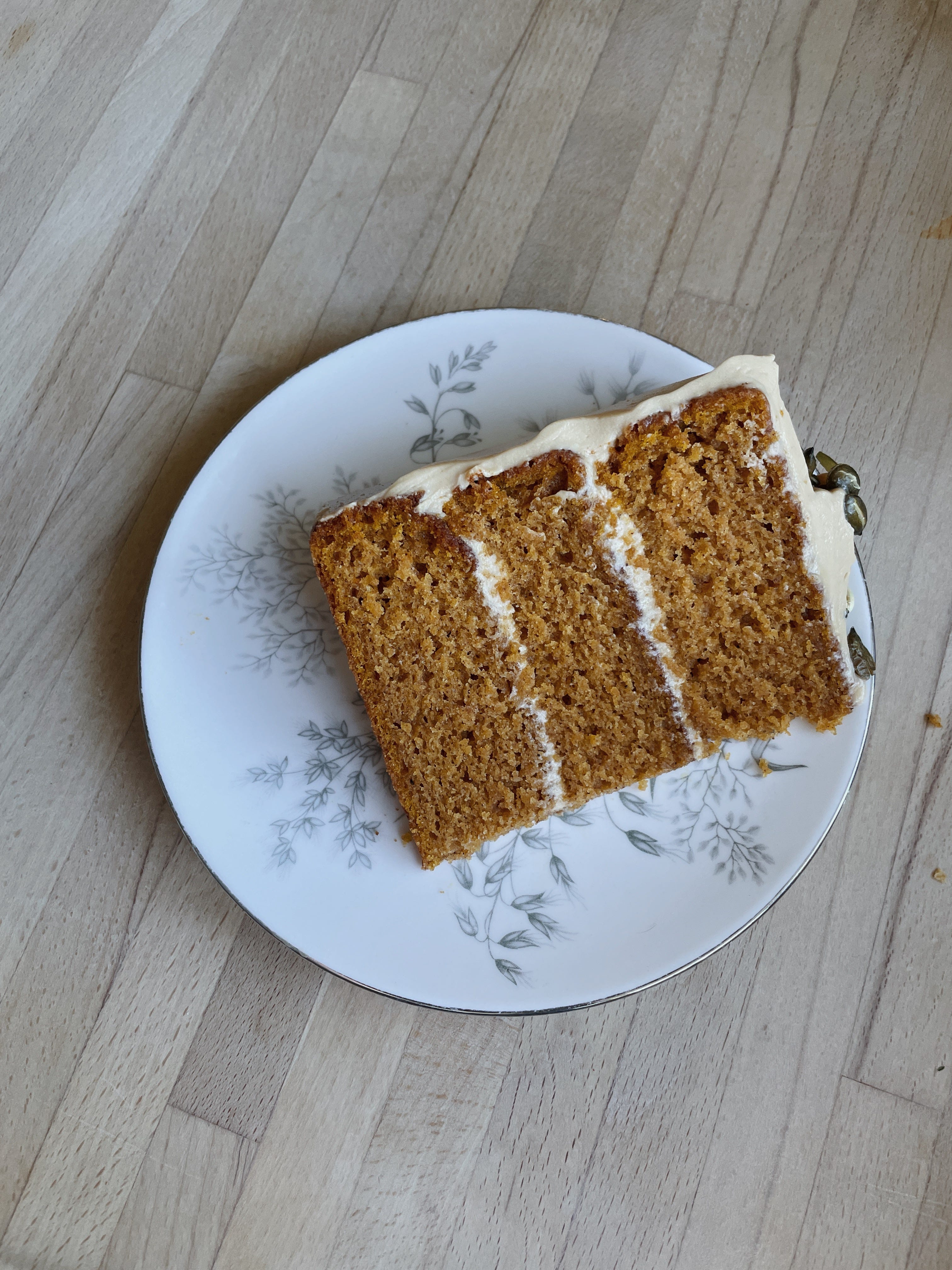 This pumpkin cake is a riff on a Cupcake Jemma recipe, (fun fact, CJ’s Youtube channel saved me from one of my most challenging periods of anxiety back in 2017, during this time I really struggled to sleep… I would spend night after night watching her video's on Youtube which were an excellent antidote to my anxiety.) It has a stunning golden hue and is ultra-tender with a mellow hit of spice. I’ve then adapted a cream cheese icing recipe from legend, Dan Lepard, incorporating a touch of coffee for the ‘latte’ element to this Pumpkin latte cake. I’m going to be totally honest at this point and admit that I haven’t actually tried a Pumpkin spice latte before… I know, I’m a complete Charlatan for trying to replicate it in cake form without any idea of what I’m aiming for. Nevertheless, this tastes how I imagine it should, and frankly, it’s yummy, soooo, that’s all that matters right?